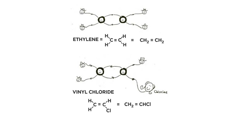 Per esempio, le molecole di etilene e cloruro di vinile (PVC), la parti costituenti di due famiglie di plastiche molto comuni, possono avere un doppio legame, possibile perché un atomo di carbonio ha quattro braccia e può trattenere un altro carbonio con due di essi, lasciando che gli altri due contengano idrogeni, ossigeni, cloro o altro.